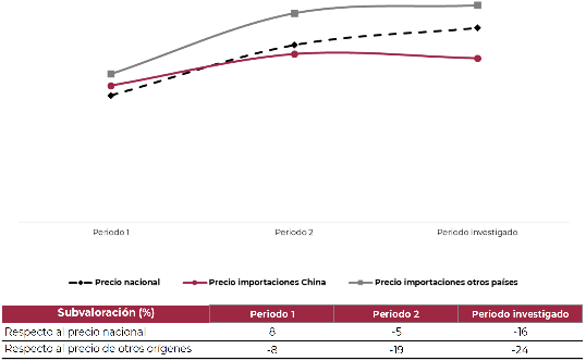 f. La Secretaría disiente del señalamiento de las exportadoras en relación a que el crecimiento del precio nacional fue la causa de la caída de las ventas al mercado interno de los productores nacionales. Al respecto, y como ya se indicó en el apartado de precios de la presente Resolución, tanto los precios del producto nacional como de las importaciones originarias de China se incrementaron en el periodo analizado. Sin embargo, el aumento fue diferenciado, ya que el precio de las importaciones chinas cayó 3% en el periodo investigado. Como consecuencia, se observaron niveles de subvaloración en el periodo 2 de 5% y en el periodo investigado de 16%. Ante esta brecha en los precios, resulta lógico que el producto investigado en condiciones de dumping y a precios más bajos, resulte más atractivo para los consumidores y desplacen sus compras de producto nacional por producto importado, como lo sustenta el análisis de ventas a clientes de la rama de producción nacional descrito en el punto 447 de la presente Resolución.