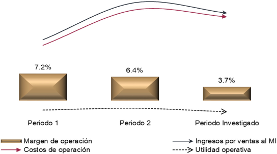 v. Destaca que la caída de las ventas al mercado interno está asociada fundamentalmente al incremento que registraron las importaciones investigadas realizadas en condiciones de discriminación de precios. Asimismo, otros indicadores relevantes de la rama de producción nacional orientados al mercado interno registraron un comportamiento negativo durante el periodo investigado: la PNOMI descendió 9%; la utilización de la capacidad disminuyó 15 puntos porcentuales, y los ingresos y las utilidades operativas derivadas de las ventas al mercado interno disminuyeron 9.3% y 47.7%, respectivamente, en tanto que el margen operativo descendió 2.7 puntos porcentuales.