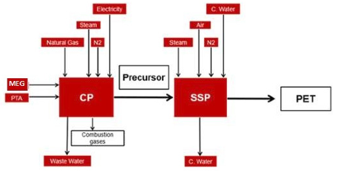 a. Primera etapa, proceso continuo, en adelante CP, por las siglas en inglés de Continuous Process: en esta etapa se hará reaccionar al PTA con el MEG (más los aditivos) para formar una pasta y el monómero (2-BHET) que dará vida al PET. Una vez formado el monómero, este reaccionará de manera repetitiva con moléculas del mismo monómero, así como con moléculas de los comonómeros. El resultado final de este proceso será PET amorfo en forma de pellets. Los materiales para generar la energía y llevar a cabo el proceso son, gas natural para el calentamiento de las líneas, vapor y electricidad para el funcionamiento de los motores, además de nitrógeno (N2) como agente propulsor en algunas de las líneas.