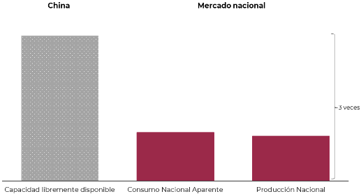 501. De acuerdo con la información señalada en el punto 607 de la Resolución Preliminar de la consultora especializada Wood Mackenzie, Trade Map y UN Comtrade, la Secretaría observó que la industria fabricante de resina de PET de China cuenta con una capacidad libremente disponible considerable en relación con el tamaño de la producción y el mercado nacional del producto investigado. En efecto, en el periodo investigado, la capacidad libremente disponible (capacidad instalada menos producción) de China podría cubrir hasta 3 veces el CNA y la producción nacional, respectivamente.