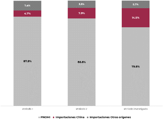 pasar de una participación del 4.7% en el periodo 1 a 14.5% en el periodo investigado, y 12 puntos porcentuales respecto de la producción nacional al pasar de 4% en el periodo 1 a 16% en el periodo investigado.