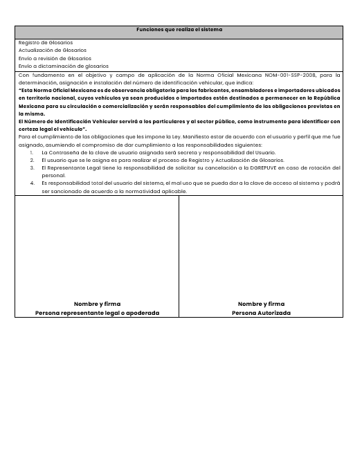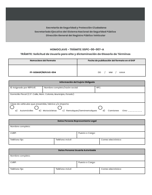 | 1 | SSPC-00-007-A | Notificaciones de Ensambladoras Glosarios de Términos | 1. Archivo del Catálogo de Distribuidoras. 2. Antes de realizar la inscripción de los vehículos, las ensambladoras deberán informar al Secretariado Ejecutivo el glosario de términos de los vehículos que ensambla, fabrica o importa, a fin de que el Secretariado Ejecutivo desglose y cuente con la información que cada uno vaya a inscribir verificando el Número de Identificación Vehicular (NIV). | 1. Se simplifica el requisito del trámite, para quedar como sigue: Único: Formato de solicitud de Usuario para alta y dictaminación de Glosario de Términos. 2. Se simplifica la denominación del trámite: Solicitud de Usuario para alta y dictaminación de Glosario de Términos 3. Se implementa el Formato: FF-SESNSP/REPUVE-004 |