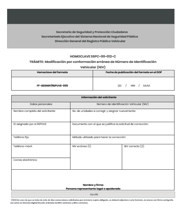 | 2 | SSPC-00-012-C | Solicitud de actualización o modificación a la información en la inscripción por parte de los sujetos obligados Modificación por conformación erronea del Número de Identificación Vehicular | 1. Escrito Libre (de solicitud o petición). El escrito debe contener todos los datos señalados para atenderse en el plazo indicado. Datos a corregir con causa justificada, firma del titular o titulares responsables del envío de la información o en su caso apoderado legal de la empresa. Enviar por mensajería el expediente con la información a corregir. | 1. Se simplifica el requisito del trámite, para quedar como sigue: Único: Formato de solicitud de corrección por conformación errónea de Número de Identificación Vehicular (NIV). 2. Se simplifica la denominación del trámite: Modificación por conformación errónea de Número de Identificación Vehicular (NIV). 3. Se implementa el Formato: FF-SESNSP/REPUVE-005 |