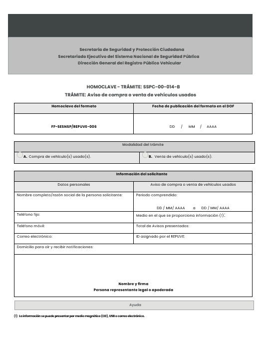 | 3 | SSPC-00-014-B | Aviso de venta Aviso de venta de vehículo usado. | 1. CD Adjunto. 2. Escrito libre de solicitud. 3. Presentar el escrito firmado por el representante legal. Adjuntar en un CD en el que se integre la información conforme al Anexo II A (sección III estructura de información) de los procedimientos de operación del Registro Público Vehicular. El sujeto obligado podrá enviar por paquetería su escrito firmado por el representante legal y adjuntar el cd con la información conforme al Anexo II a Sección III Estructura de información de los procedimientos de operación del Registro Público Vehicular. | 1. Se simplifica el requisito del trámite, para quedar como sigue: Único: Formato de Aviso de compra o venta de vehículos usados. 2. Se simplifica la denominación del trámite: Aviso de compra o venta de vehículos usados 3. Se implementa el Formato: FF-SESNSP/REPUVE-006 |