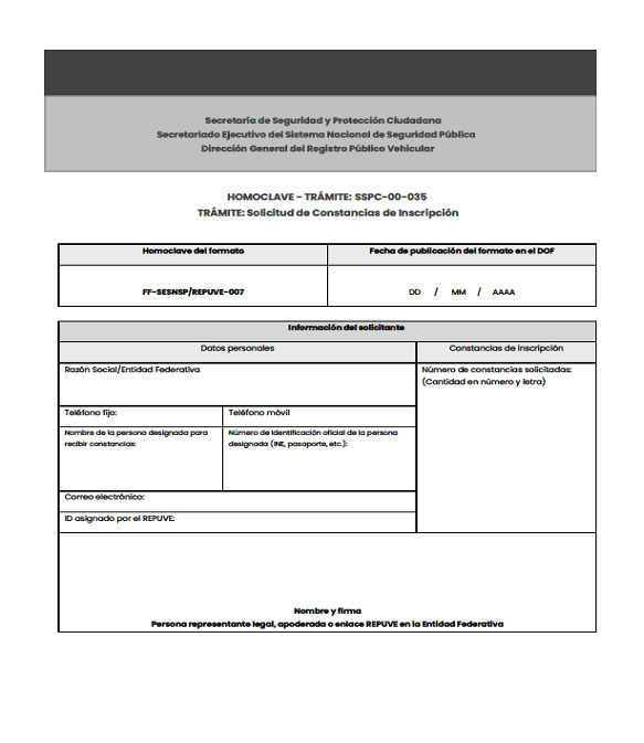 | 4 | SSPC-00-035 | Solicitud de entrega de las constancias de inscripción | 1. Escrito libre de solicitud. 2. Solicitud en hoja membretada, Indicar el número de constancias de inscripción solicitadas, Firma del representante legal o apoderado legal de la empresa, Enviar por mensajería el expediente con la información a corregir. | 1. Se simplifica el requisito del trámite, para quedar como sigue Único: Formato de Solicitud de Constancias de Inscripción. 2. Se simplifica la denominación del trámite: Solicitud de Constancias de Inscripción 3. Se implementa el Formato: FF-SESNSP/REPUVE-007 |