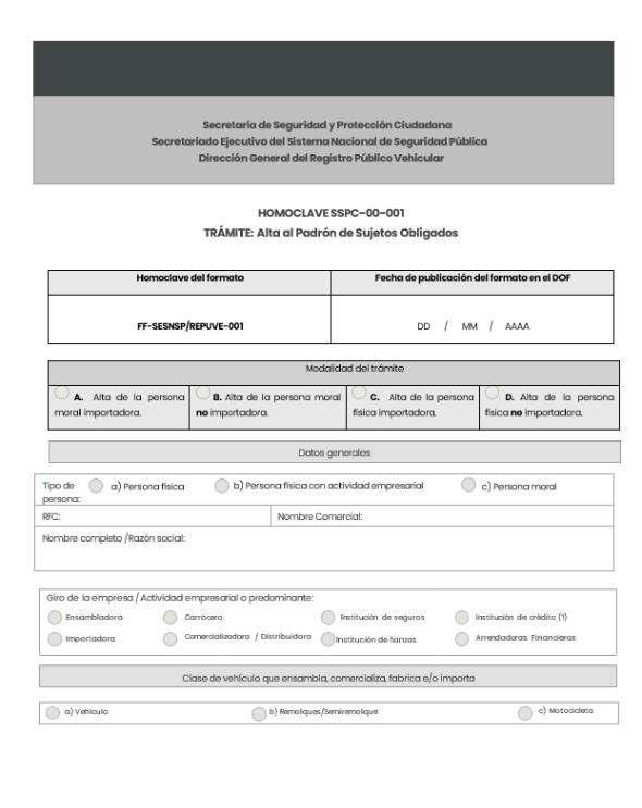 | 1 | SSPC-00-001-A | Alta al Padrón de Sujetos Obligados. Alta de persona moral que no es importador. | 1. Se fusionan los trámites: SSPC-00-001-A, SSPC-00-001-B, SSPC-00-001-C, y SSPC-00-001-D. 2. Se actualiza la denominación del trámite: Alta al Padrón de Sujetos Obligados 3. Se unifica Homoclave del trámite: SSPC-00-001 4. Se establece Formato: FF-SESNSP/REPUVE-001 | Requisitos: 1. Formato con firma autógrafa: FF-SESNSP/REPUVE-001. 2. Constancia laboral de la persona usuaria (original). 3. Identificación oficial vigente de la persona usuaria (INE o Pasaporte) (original y copia). 4. Constancia de Situación Fiscal de la Empresa (no mayor a tres meses). 5. Acta constitutiva de la empresa en copia simple y copia certificada para cotejo. 6. En su caso, documento que acredite la personalidad de la persona representante legal o apoderada de la empresa (original y copia). Modalidades: 1. Alta de la persona moral importadora. 2. Alta de la persona moral no importadora. 3. Alta de la persona física importadora. 4. Alta de la persona física no importadora. Tiempo de respuesta: 15 días. |