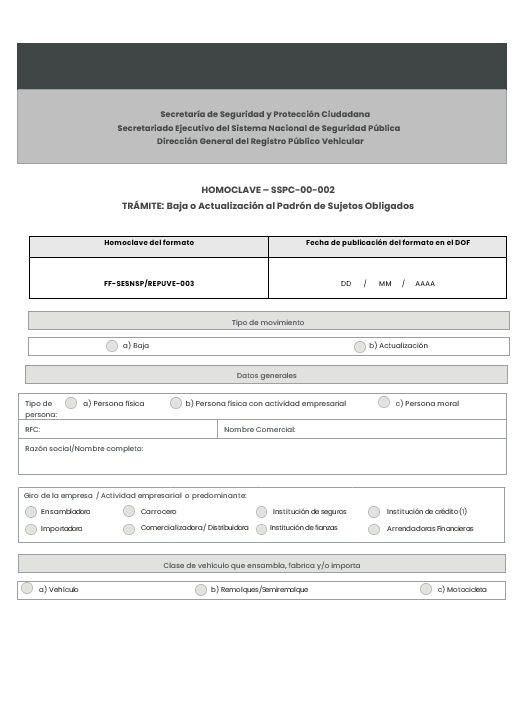 | 5 | SSPC-00-002 | Baja al Padrón de Sujetos Obligados. | 1. Se fusionan los trámites: SSPC-00-002 y SPC-00-003. 2. Se actualiza la denominación del trámite: Baja o Actualización del Padrón de Sujetos Obligados 3. Se unifica Homoclave del trámite: SSPC-00-002 4. Se establece Formato: FF-SESNSP/REPUVE-003. | Requisitos: 5. Formato con firma autógrafa: FF-SESNSP/REPUVE-003. 6. Identificación oficial vigente de la persona usuaria (INE o Pasaporte) (original y copia). 7. En su caso, documento que acredite la personalidad de la representante legal o apoderada de la empresa (original y copia). 8. En su caso, documento que acredite el motivo de actualización (cambio de razón social, de domicilio fiscal, de representante legal, etc.) Modalidades: 1. Baja del Padrón de Sujetos Obligados. 2. Actualización del Padrón de Sujetos Obligados. Tiempo de respuesta: 15 días. |