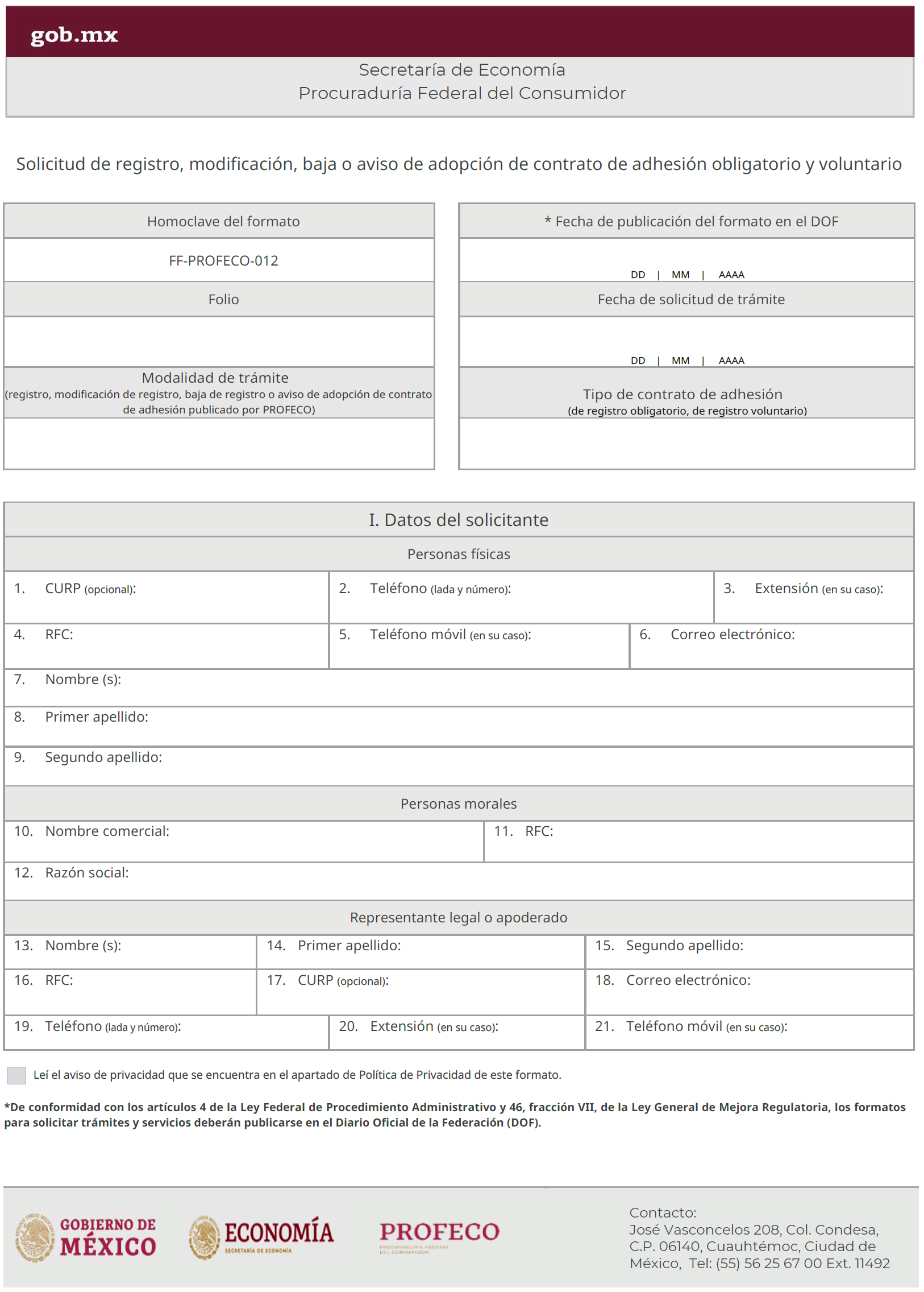 | 3 | PROFECO-00-014-A | Solicitud de aviso de adopción de modelos de contratos de adhesión publicados por PROFECO | Personas físicas |