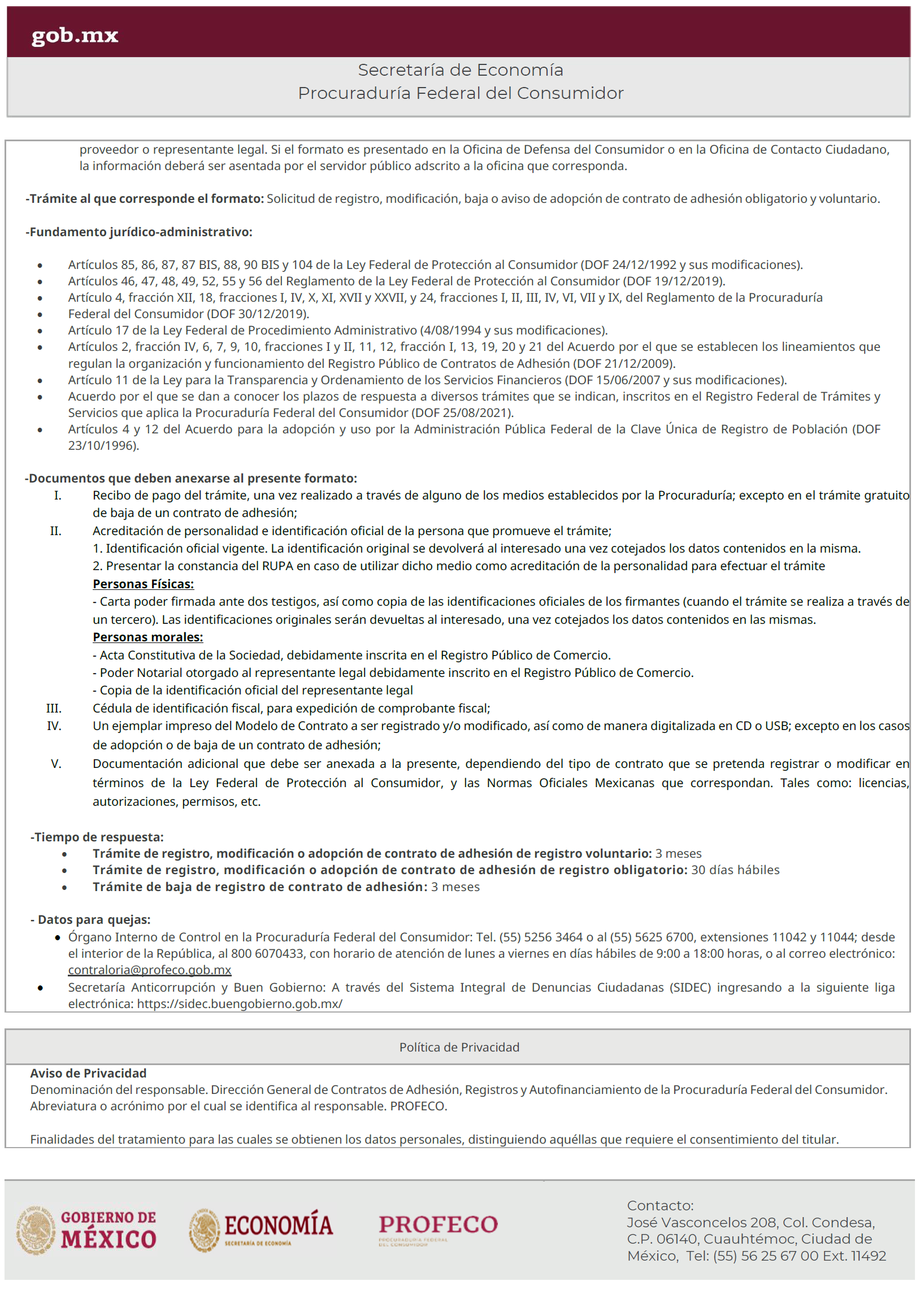 | 1 | PROFECO-00-001-A | Solicitud de registro y/o modificación de registro obligatorio de contratos de adhesión. | Personas Físicas | Fusión de los trámites con homoclaves PROFECO-00-001-A; PROFECO-00-001-B; PROFECO-00-014-A: PROFEC O-00-014-B; PROFECO-00-022-A, PROFECO-00-022-B, PROFECO-00-015-A, y PROFECO-00-015-B Para quedar como: Solicitud de registro, modificación, baja o aviso de adopción, de contrato de adhesión obligatorio y voluntario. Con las modalidades de: a) De registro y/o modificación para personas físicas b) De registro y/o modificación para personas morales c) De baja de registro para personas físicas d) De baja de registro para personas morales e) Aviso de adopción de modelos para personas físicas f) Aviso de adopción de modelos para personas morales g) De modificación y/o registro voluntario de contratos de adhesión para personas físicas. h) De modificación y/o registro voluntario de contratos de adhesión para personas morales. | Modalidades a) De registro y/o modificación para personas físicas b) De registro y/o modificación para personas morales e) Aviso de adopción de modelos para personas físicas f) Aviso de adopción de modelos para personas morales g) De modificación y/o registro voluntario de contratos de adhesión para personas físicas. h) De modificación y/o registro voluntario de contratos de adhesión para personas morales. 1.- Solicitud requisitada; 2.- Recibo de pago del trámite, una vez realizado a través de alguno de los medios establecidos por la Procuraduría; 3.- Acreditación de personalidad e identificación oficial de la persona que promueve el trámite. 4.- Si se trata de personas físicas, cuando el trámite se realice a través de un tercero no acreditado ante la Procuraduría, deberá presentarse copia de la identificación oficial del proveedor, del apoderado y carta poder firmada ante dos testigos. En el caso de personas morales, se deberá presentar acta constitutiva y poder notarial para representarla, así como copia de la identificación oficial del representante legal; 5.- Cédula de identificación fiscal, para expedición de comprobante fiscal; 6.- Modelo de contrato contenido en un medio de comunicación electrónica y, en el caso del trámite electrónico, modelo de contrato electrónico; excepto en los casos de adopción o de baja de un contrato de adhesión; 7.- Los que adicionalmente señale la Ley, las NOM's y los instrumentos normativos encargados de salvaguardar los derechos de los consumidores. Modalidades: c) De baja de registro para personas físicas d) De baja de registro para personas morales 1.- Solicitud requisitada; 2.- Acreditación de personalidad e identificación oficial de la persona que promueve el trámite. 3.- Si se trata de personas físicas, cuando el trámite se realice a través de un tercero no acreditado ante la Procuraduría, deberá presentarse copia de la identificación oficial del proveedor, del apoderado y carta poder firmada ante dos testigos. En el caso de personas morales, se deberá presentar acta constitutiva y poder notarial para representarla, así como copia de la identificación oficial del representante legal; |