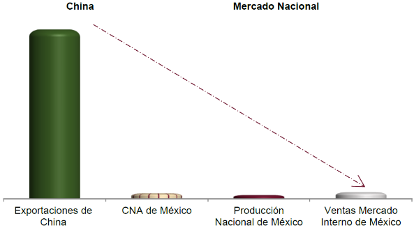 280. Las asimetrías entre estos indicadores aportan elementos suficientes que permiten determinar que la utilización de una parte de la producción con que China cuenta, o bien, de sus exportaciones totales, podría ser significativa para la producción nacional y abastecer por completo el mercado mexicano.