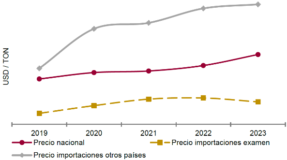 b. El precio nacional promedio de la mercancía similar destinada al mercado interno, expresado en términos reales y en moneda nacional, también registró un desempeño mixto, incrementó 3.1% en 2020, disminuyó 1.6% en 2021, aumentó 3.6% en 2022 y bajó 0.9% en el periodo de examen, de forma que observó un incremento de 4.1% durante el periodo analizado.