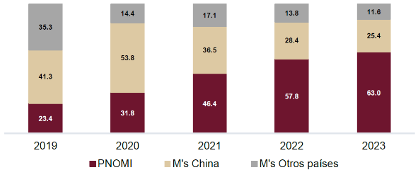 h. China cuenta con un potencial exportador considerable en relación con el tamaño del mercado mexicano. En 2023, este indicador fue equivalente a 45 veces el tamaño de la producción nacional, 25 veces el de las ventas al mercado interno y 30 veces el del CNA de atomizadores de plástico de México.