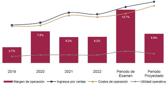 246. Respecto del margen operativo, la Secretaría observó un incremento de 3.8 puntos porcentuales en 2020, una disminución de 1.3 puntos porcentuales en 2021, sin cambios en 2022, y un incremento de 6.5 puntos porcentuales en el periodo de examen, de forma que se tuvo un crecimiento de 9 puntos porcentuales durante el periodo analizado, al pasar de un margen operativo de 3.7% en 2019 a 12.7% en el periodo de examen.