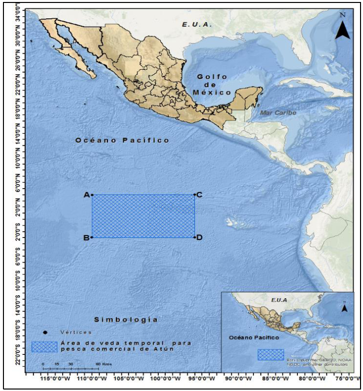 ARTÍCULO SEXTO. Se establece veda temporal para la pesca comercial de atún aleta amarilla (Thunnus albacares), patudo o atún ojo grande (Thunnus obesus), atún aleta azul (Thunnus orientalis) y barrilete (Katsuwonus pelamis) con embarcaciones atuneras de cerco de 182 y más toneladas métricas de capacidad de acarreo y embarcaciones de palangre de más de 24 metros de eslora total, con bandera mexicana, desde las 00:00 horas del 9 de octubre hasta las 24:00 horas del 8 de noviembre de 2025 y 2026, en la zona comprendida entre los 96° y 110° Longitud Oeste y los 4° Norte y 3° Latitud Sur, del Océano Pacífico Oriental, conforme al polígono con vértices A, B, C y D que se ilustra en la siguiente figura: