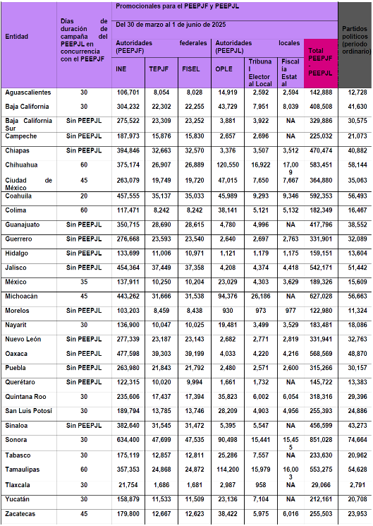 XX. Aprobación del Presupuesto de Egresos de la Federación para el Ejercicio Fiscal 2025. El 12 de diciembre de 2024, la Cámara de Diputados del Congreso de la Unión, aprobó el Presupuesto de Egresos de la Federación para el Ejercicio Fiscal 2025; en el que se determinó una disminución del 67% para la organización del PEEPJF 2024-2025 solicitado por el Instituto.