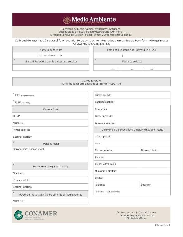| FF-SEMARNAT-130 | SEMARNAT-2022-071-003-A | Solicitud de autorización para el funcionamiento de centros no integrados a un centro de transformación primaria |