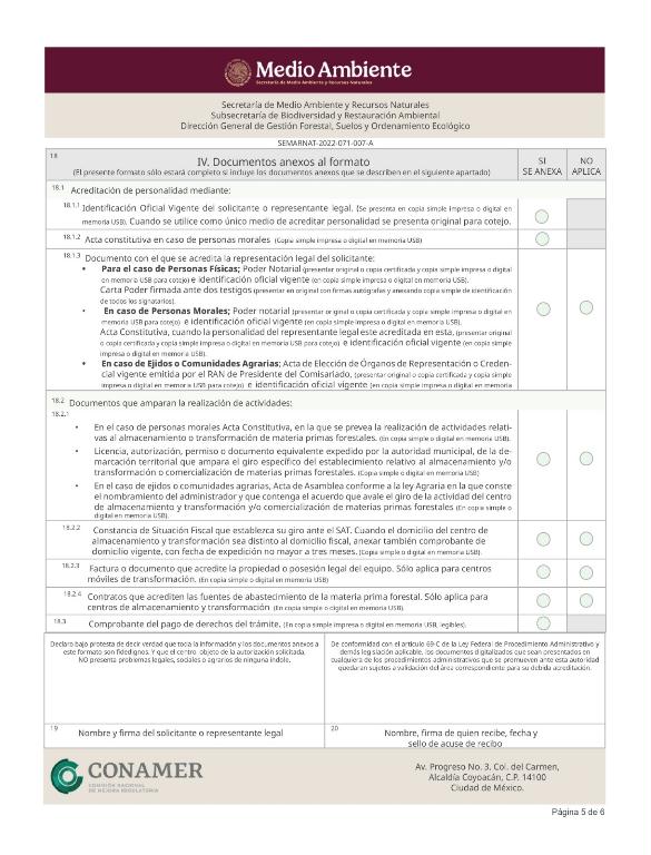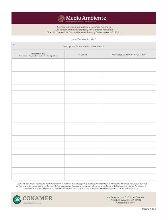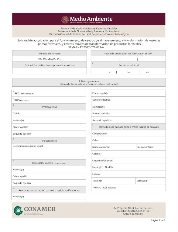 | FF-SEMARNAT-131 | SEMARNAT-2022-071-007-A | Solicitud de autorización para el funcionamiento de centros de almacenamiento y transformación de materias primas forestales, y centros móviles de transformación de productos forestales |