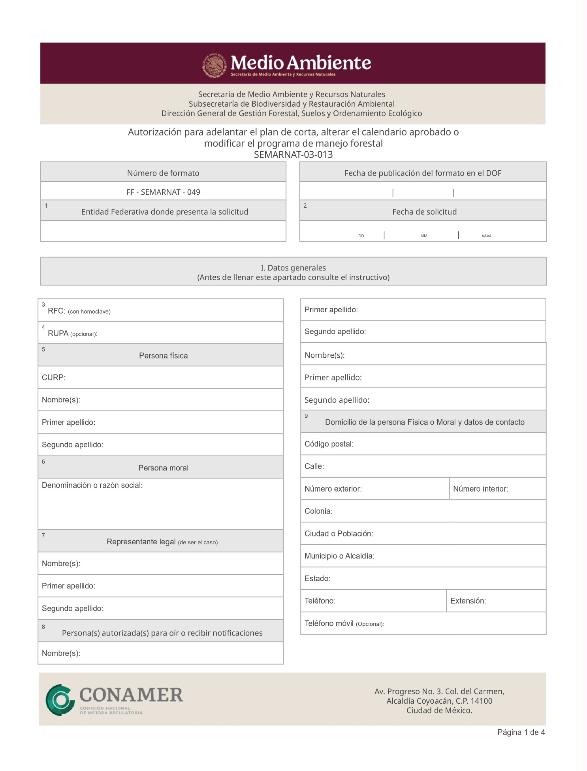 | FF-SEMARNAT-049 | SEMARNAT-03-013 | Autorización para adelantar el plan de corta, alterar el calendario aprobado o modificar el programa de manejo forestal | 15 de diciembre de 2015 |