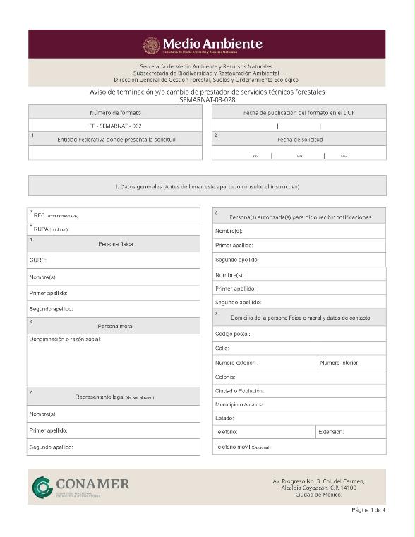 | FF-SEMARNAT-062 | SEMARNAT-03-028 | Aviso de terminación y/o cambio de prestador de servicios técnicos forestales | 17 de octubre de 2016 |