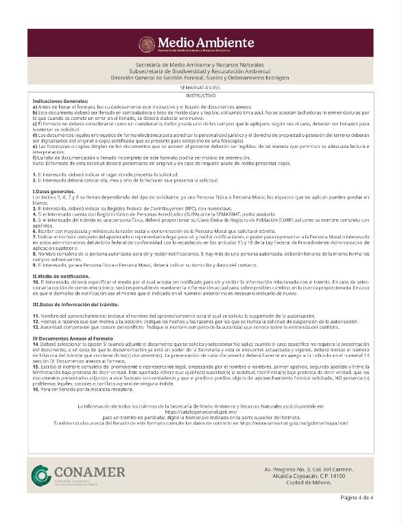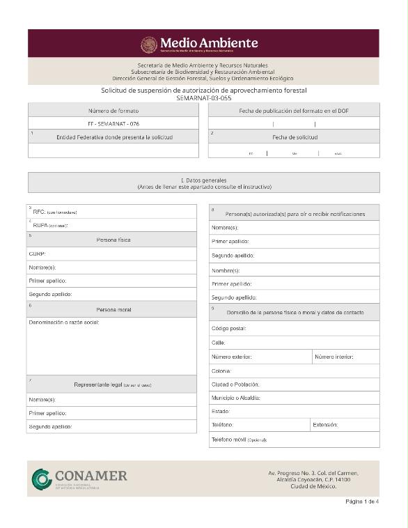 | FF-SEMARNAT-076 | SEMARNAT-03-055 | Solicitud de suspensión de autorización de aprovechamiento forestal | 17 de octubre de 2016 |