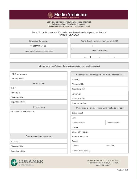 | FF-SEMARNAT-084 | SEMARNAT-04-006 | Exención de la presentación de la manifestación de impacto ambiental | 02 de febrero de 2022 |