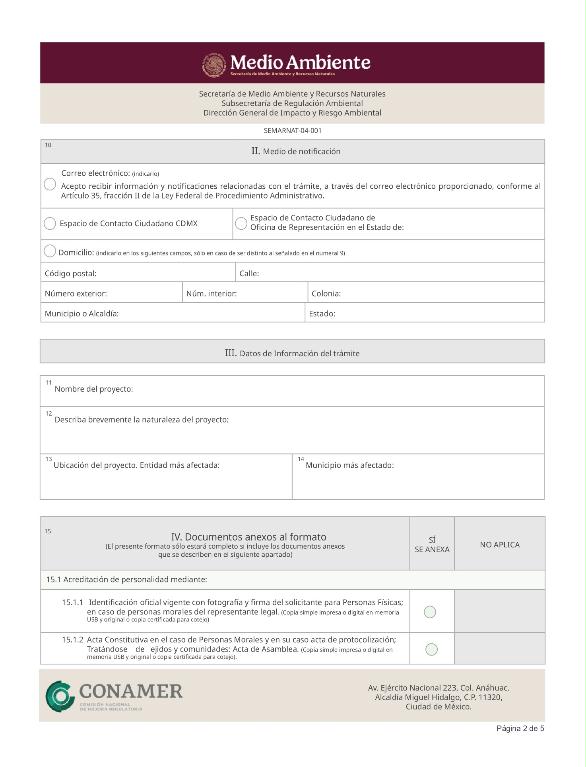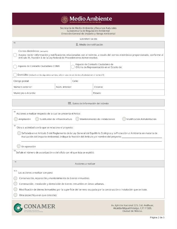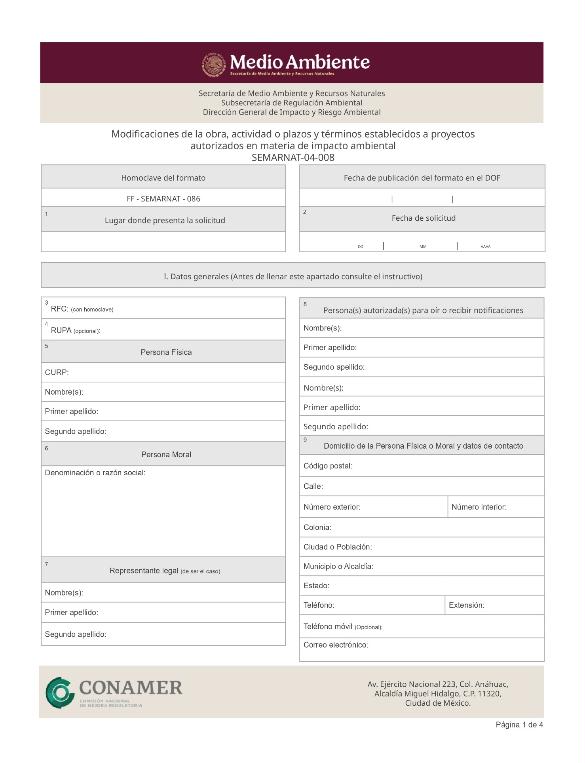 | FF-SEMARNAT-086 | SEMARNAT-04-008 | Modificaciones de la obra, actividad o plazos y términos establecidos a proyectos autorizados en materia de impacto ambiental. | 02 de febrero de 2022 |