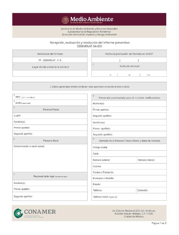 | FF-SEMARNAT-116 | SEMARNAT-04-001 | Recepción, evaluación y resolución del informe preventivo | 02 de febrero de 2022 |