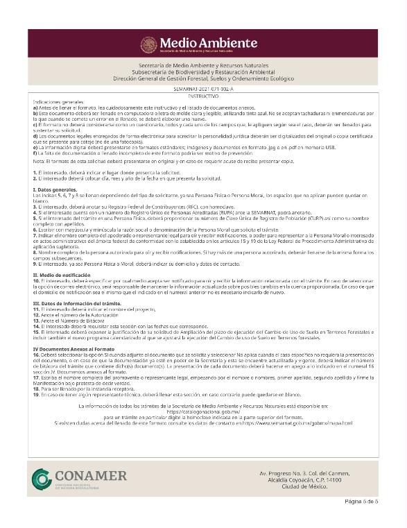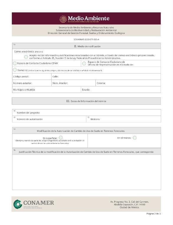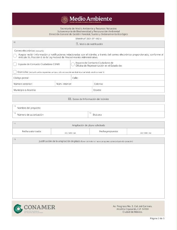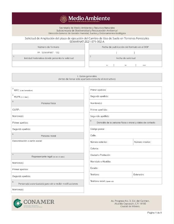 | FF-SEMARNAT-132 | SEMARNAT-2021-071-002-A | Solicitud de ampliación del plazo de ejecución del cambio de uso de suelo en terrenos forestales |