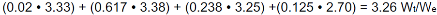 = (0.02 x3.32) + (0.617 x 3.55) + (0.238 x 3.29) + (0.125 x 2.85) = 3.40 Wt/We