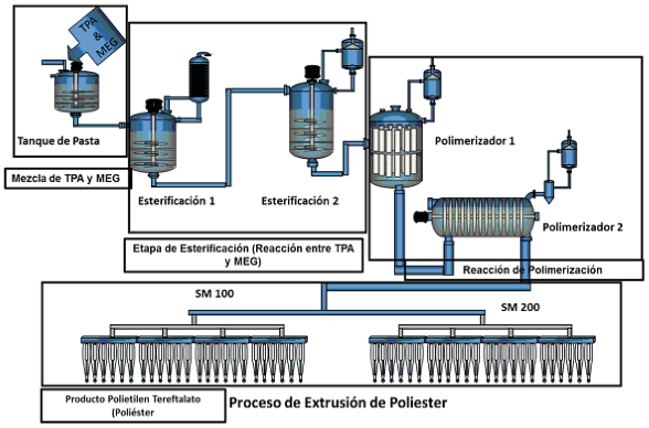 15. El PTA se mezcla con la solución de MEG y el catalizador hasta formar una pasta, la cual alimenta al sistema de esterificación, mismo que tiene lugar a presión atmosférica mediante la separación del agua. De esta forma, el producto de la etapa de esterificación se envía posteriormente a la unidad de policondensación previa (polimerizador 1), donde la reacción tiene lugar bajo vacío y el producto de pre-policondensación alimenta al reactor de policondensación final (polimerizador 2, que opera a mayor temperatura y vacío) para finalmente, procesar (extruir) el poliéster fundido en fibras y/o filamentos.