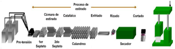 16. Para obtener la fibra corta, los filamentos obtenidos se recolectan en botes y se reúnen para ser estirados y lograr el denier requerido. Posteriormente, se termofijan en rodillos calientes y luego en unos fríos, para fijar la tenacidad, para después rizarlos y agregar el acabado (apresto). Finalmente, para el uso final se seca, se corta y se empaca en fardos, pacas o balas (como suele ser llamada la presentación).