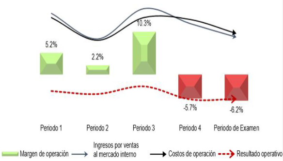 229. En cuanto al comportamiento de los resultados operativos proyectados del mercado interno, la Secretaría observó que los ingresos por ventas en el mercado interno reportarían una baja de 11% y un incremento de los costos de operación de 0.3%, lo que daría lugar a un aumento de la pérdida operativa de 182%, mientras que el margen operativo negativo aumentaría 13.5 puntos porcentuales al pasar de -6.2% a -19.7%.