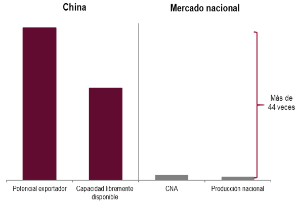 247. Los resultados descritos en los puntos anteriores sustentan que China cuenta con una capacidad libremente disponible y un potencial exportador que superan varias veces el tamaño del mercado nacional. Estas asimetrías aportan elementos suficientes que indican que la reorientación de una parte de la capacidad libremente disponible con que cuenta la industria China, fabricante del producto objeto de examen, o bien, de su potencial exportador, podría ser significativa para la producción y el mercado mexicano.