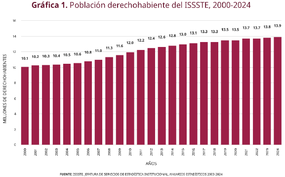 Al cierre de 2024, la población derechohabiente ascendió a 13.9 millones, de los cuales 3.2 millones de personas trabajadoras en activo; 1.3 millones de pensionados y 9.3 millones de familiares. En la Gráfica 1 se presenta la evolución en los últimos 24 años de la población derechohabiente.