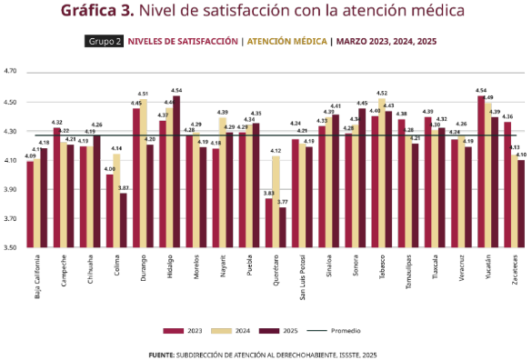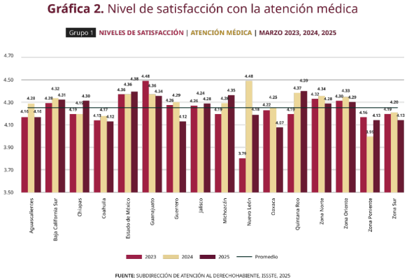 | Observaciones | "Satisfacción con el servicio" corresponde a las respuestas "Muy satisfecho (a)" o "Satisfecho (a)" con los servicios de salud otorgados por el ISSSTE, conforme a los resultados reportados en la Encuesta Nacional de Calidad e Impacto Gubernamental (ENCIG) realizada por el INEGI. Debido al diseño muestral de la ENCIG, los resultados no representan al total del universo de derechohabientes del ISSSTE, sino únicamente a la población usuaria efectiva en ciudades de 100 mil y más habitantes de toda la república mexicana. |