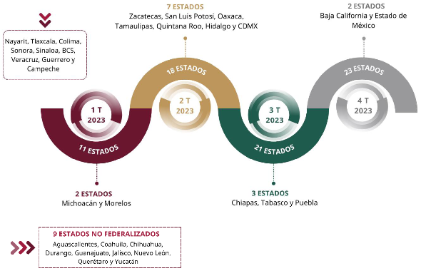 El 29 de mayo de 2023, se publicaron en el DOF nuevas reformas a la Ley General de Salud para regular el Sistema de Salud para el Bienestar; éstas otorgaron a la Federación funciones concurrentes con las entidades federativas para organizar, operar, supervisar y evaluar los servicios de salud, reduciendo la heterogeneidad en la atención médica. La transferencia fortaleció las capacidades de IMSS-BIENESTAR para proveer servicios de salud, equipar unidades de salud, mejorar la infraestructura y garantizar su mantenimiento permanente, sentando las bases para la transformación de la salud pública mexicana y la consolidación de un modelo de atención médica gratuita, integral y universal.