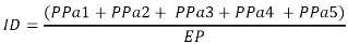| Sustitución en método de cálculo | ![]() ID: Índice de Dignificación PPa: Porcentaje de participación de las dependencias y entidades en las acciones de cada estrategia EP: Número de estrategias Programadas | |||||||||