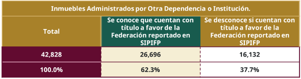 | 2.2.5 Fomentar que las Instituciones Públicas coadyuven con las acciones y gestiones pertinentes para contar con los documentos jurídicos que amparen la adquisición, incorporación, destino, uso y aprovechamiento, desincorporación o enajenación de los inmuebles federales. | INDAABIN |