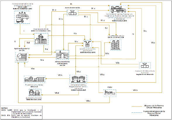 · NOM-013-ASEA-2021, Instalaciones de Almacenamiento y Regasificación de Gas Natural Licuado (cancela y sustituye a la NOM-013-SECRE-2012 Requisitos de seguridad para el diseño, construcción, operación y mantenimiento de terminales de almacenamiento de gas natural licuado que incluyen sistemas, equipos e instalaciones de recepción, conducción, vaporización y entrega de gas natural). Publicada en el Diario Oficial de la Federación el 29 de noviembre de 2021.