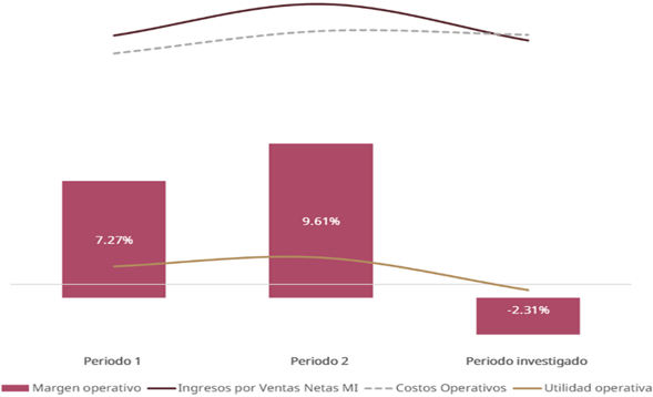 d. La concurrencia de las importaciones de calzado originarias de China en condiciones de discriminación de precios, incidió negativamente en los indicadores económicos y financieros relevantes de la rama de producción nacional durante el periodo analizado y principalmente en el periodo investigado, entre ellos: producción (10%), POMI (10%), participación de mercado (2 puntos porcentuales), volumen de ventas al mercado interno (15%), capacidad instalada (2.5%), utilización de la capacidad instalada (5 puntos porcentuales), empleo (11%), inventarios (aumentó 15%), ingresos de ventas al mercado interno (13%), utilidad operativa (121%) y margen operativo (2.31% negativo), mientras que el aumento en los costos operativos (8% en el periodo analizado) no pudo trasladarse a los precios nacionales.