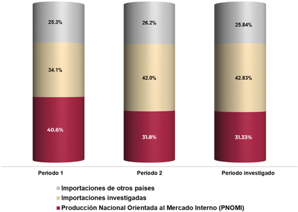 b. Las importaciones investigadas se incrementaron en términos absolutos y relativos. Durante el periodo analizado registraron un crecimiento de 59% y aumentaron su participación en el CNA en 8.7 puntos porcentuales, y 43.7 puntos porcentuales respecto de la producción nacional.