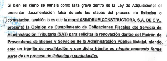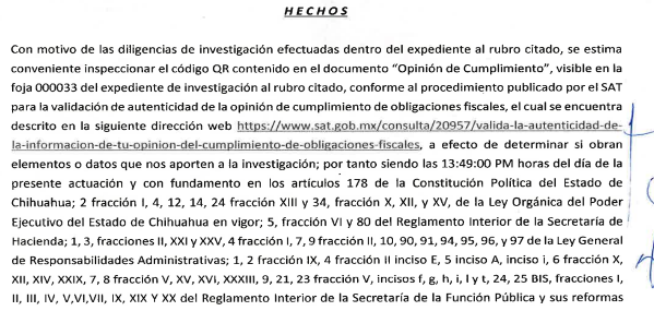 · "Por lo anterior, resulta indubitable que el particular en cita, ASINORUM CONSTRUCTORA, S.A. DE C.V., a través de sus representantes legales, con el fin de obtener la revalidación del registro en el Padrón de Proveedores de Bienes y Servicios de la Administración Pública Estatal correspondiente al ejercicio 2020, presentó ante la Dirección de Adquisiciones y Servicios de la Secretaría de Hacienda del Gobierno del Estado de Chihuahua documentación presuntamente alterada, específicamente la Opinión de Cumplimiento de Obligaciones Fiscales con número de folio 18N82953549, toda vez que la fecha del documento impreso no coincide con la información que se verificó mediante el código QR. Dicha discrepancia evidencia una alteración que permitió simular el cumplimiento de un requisito indispensable, con el propósito de obtener la autorización en el citado padrón, aprovechándose de la buena fe del Estado para participar en procedimientos de licitación y presentar propuestas para la adjudicación de contratos" (foja 6, del informe de presunta responsabilidad).