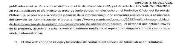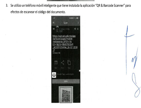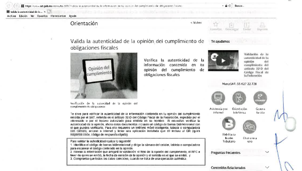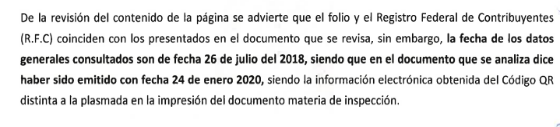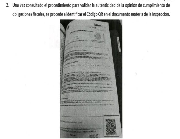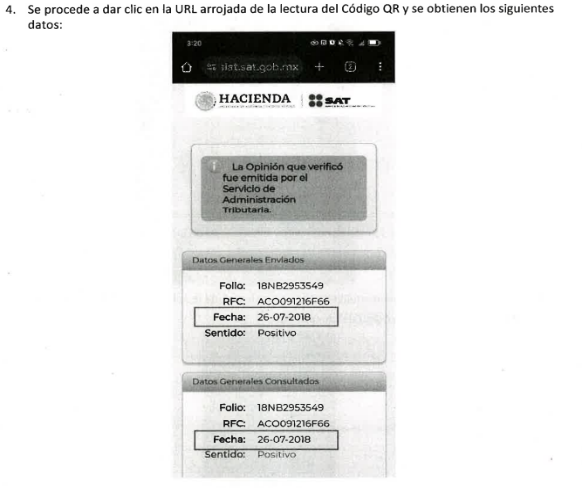 En ese sentido, se hizo del conocimiento de las autoridades competentes que, la opinión presentada y señalada en el párrafo que antecede, no coincidía con la información que brindaba el Servicio de Administración Tributaria al realizar el cotejo con el código "QR" que se encuentra en el mismo documento, esto, ya que derivado de la investigación efectuada, particularmente de la verificación de autenticidad de la información contenida en la "Opinión de Cumplimiento de Obligaciones Fiscales", mediante el código de barras bidimensional (QR) incorporado en dicho documento, se constató una alteración en la fecha de emisión del documento.