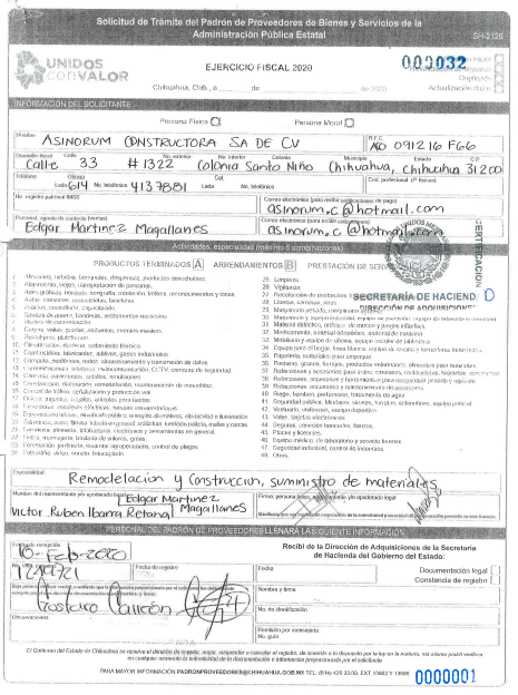 A. Con fecha diez de febrero de dos mil veinte, fue presentada en la Dirección de Adquisiciones y Servicios de la Secretaría de Hacienda la solicitud de trámite para el Padrón de Proveedores de Bienes y Servicios de la Administración Pública Estatal, con el propósito de revalidar el registro correspondiente al ejercicio 2020, por parte del particular con denominación "ASINORUM CONSTRUCTORA, S.A. DE C.V.", a través de sus representantes legales Edgar Martínez Magallanes y Víctor Rubén Ibarra Retana.