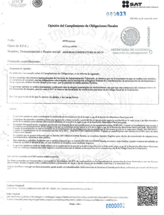 Con dicha solicitud, se presentó la Opinión de Cumplimiento de Obligaciones Fiscales del SAT, con número de folio 18NB2953549, de fecha veinticuatro de enero de dos mil veinte, en sentido positivo, mediante la cual se pretendía acreditar, en ese momento, el cumplimiento de las obligaciones fiscales correspondientes a la miscelánea fiscal del año 2020.