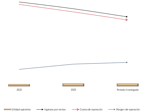 b. Como resultado del comportamiento de los ingresos por ventas y los costos operativos, los resultados operativos en el mercado interno aumentaron 30% en 2023 y disminuyeron 2% en el periodo investigado, lo que se reflejó en un aumento de 27% en la utilidad operativa durante el periodo analizado. En lo que respecta al margen operativo, se observó un aumento de 1 punto porcentual en 2023 y prácticamente se mantuvo constante durante el periodo investigado, reflejando un incremento de 1 punto porcentual en el periodo analizado, al pasar de un margen operativo de 3% en 2022 a 4% en el periodo investigado, tal como se observa en la siguiente gráfica.