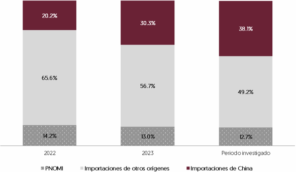203. La Solicitante indicó que la PNOMI perdió participación en el CNA en 2023, con una ligera recuperación en 2024, resultado de una disminución en el precio de la rama de producción nacional, lo que contrasta con el importante incremento de las importaciones investigadas, que en solo dos años duplicaron su participación hasta alcanzar el 43.24% en el periodo investigado. Argumentó que el desplazamiento de mercado de la industria nacional se explicó en su totalidad por la agresiva penetración de las importaciones chinas con precios bajos y en condiciones de dumping.