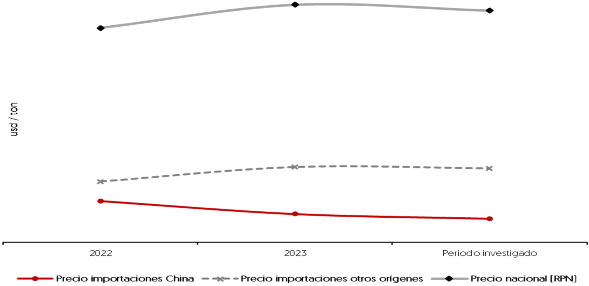 c. En el periodo analizado, el precio promedio de las importaciones investigadas mostró una caída de 20% y registró niveles crecientes de subvaloración con respecto del precio de venta al mercado interno de la rama de producción nacional, a pesar de la reducción de precios de la rama de producción nacional en el periodo investigado. En efecto, el porcentaje de subvaloración fue 65.5% en 2022, 72.8% en 2023 y 73.9% en el periodo investigado. Asimismo, se ubicó por debajo del precio promedio de las importaciones de otros orígenes en porcentajes de 17.4%, 37.5% y 40.6%, respectivamente, en los mismos periodos.
