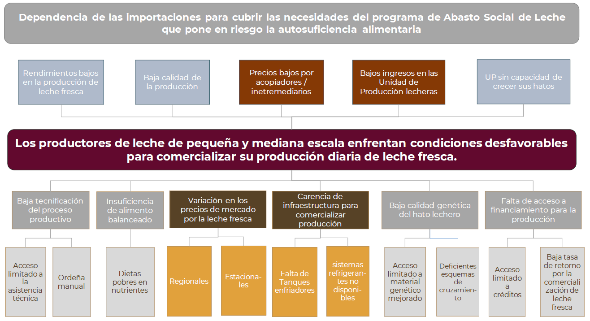 Recapitulando, las causas identificadas se relacionan con desequilibrios persistentes entre la producción, la transformación, la distribución y el acceso a los alimentos. Dichos desequilibrios generan cadenas de valor agroalimentarias frágiles, lo que a su vez deriva en baja productividad (asociada al abandono del campo y a la escasa o nula reinversión, entre otros factores), reducción de ingresos en las zonas rurales, incremento en los precios de los alimentos y, en consecuencia, mayor inseguridad alimentaria. Estos efectos resultan particularmente graves en comunidades rurales e indígenas y refuerzan la dependencia del país de los mercados internacionales, profundizando su vulnerabilidad.