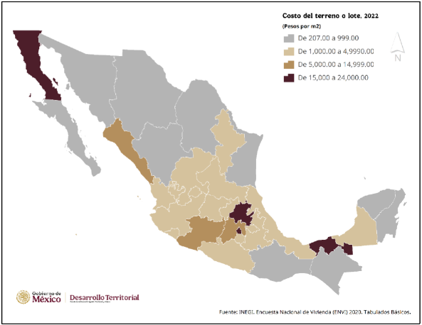 Mapa 2. Costo del terreno o lote por metro cuadrado por Entidad Federativa, 2020.